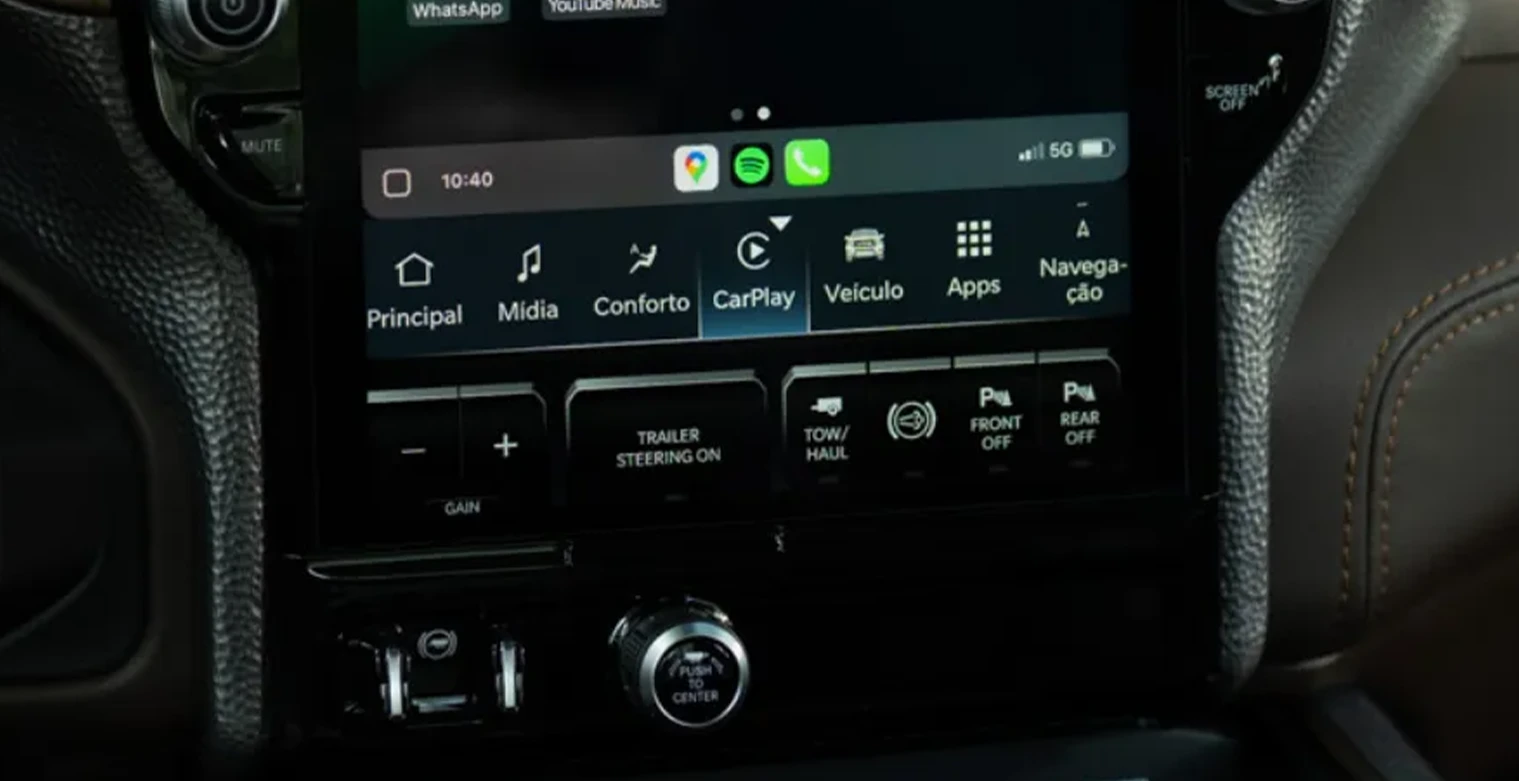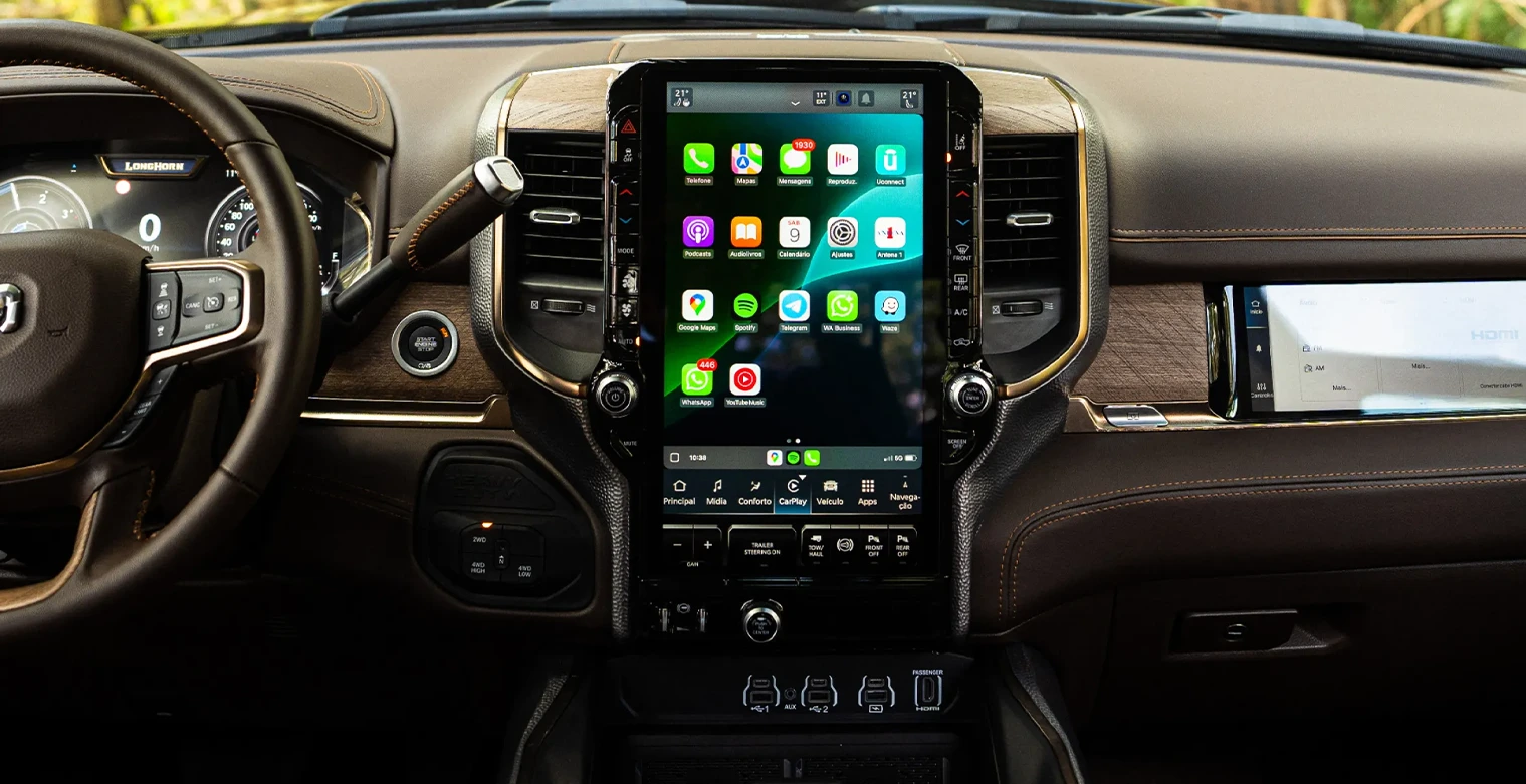 • Sistema de multimidia Uconnect de 14.5" com tela sensivel ao toque, Apple Carplay e Android Auto com conexao sem fio
